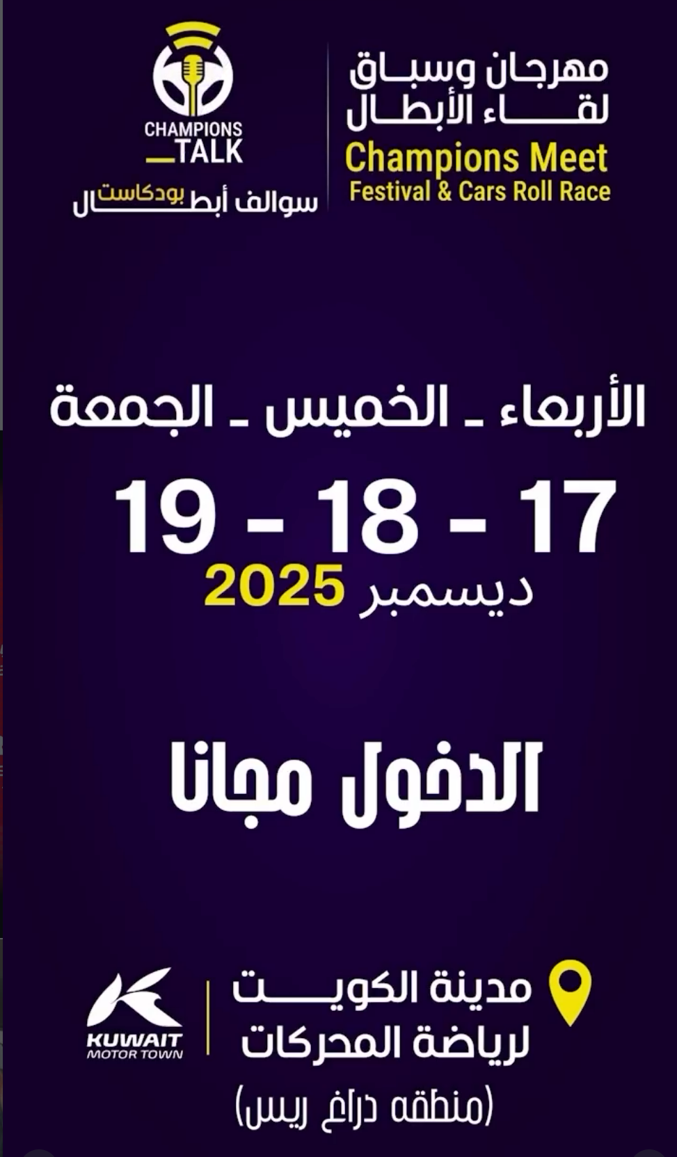 Event Type Competition,Race,VisitChampions Meet Race Festival2025wed17dec(dec 17)9:00 amfri19(dec 19)5:00 pmKuwait Motor Town9:00 am - 5:00 pm (19)(GMT+03:00)