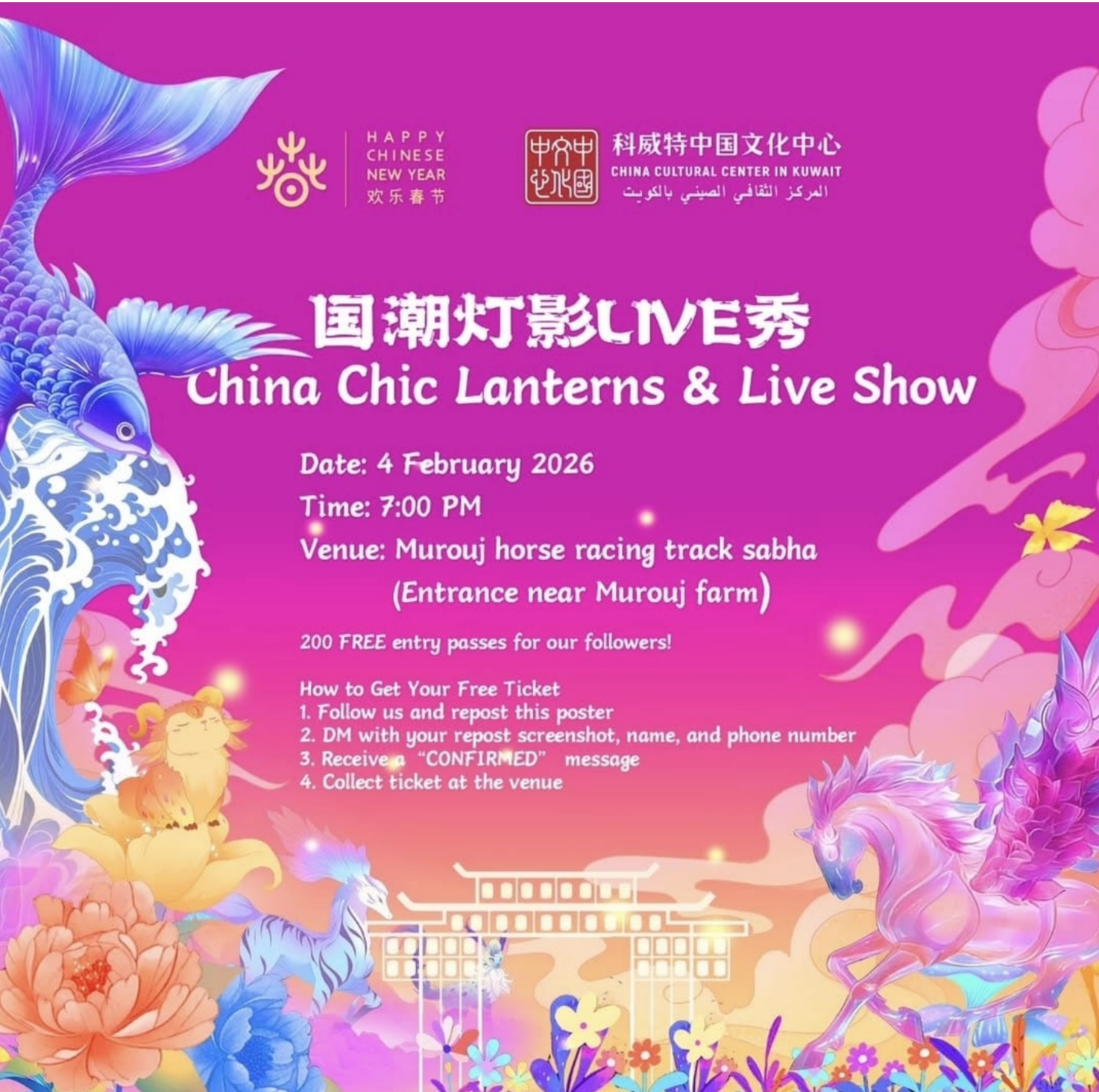 a “China Chic Lanterns & Live Show” event hosted by the China Cultural Center in Kuwait. The event is scheduled for February 4, 2026, and offers 200 free entry passes to followers through a specific process.