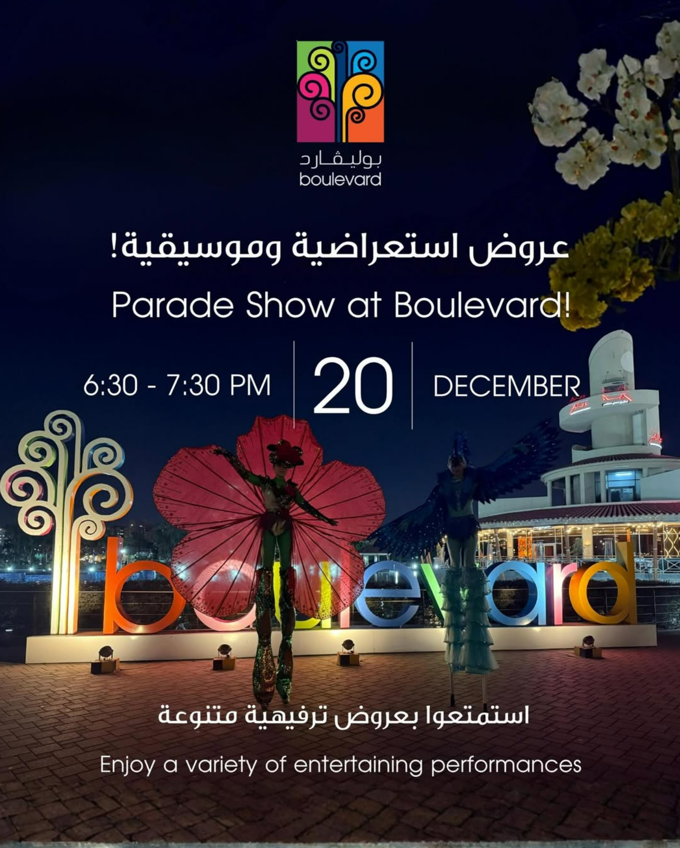 Event Type Celebration,Family,KidsParade Show at Boulevard2025sat20dec6:30 pm7:30 pmBoulevard Garden6:30 pm - 7:30 pm(GMT+03:00)