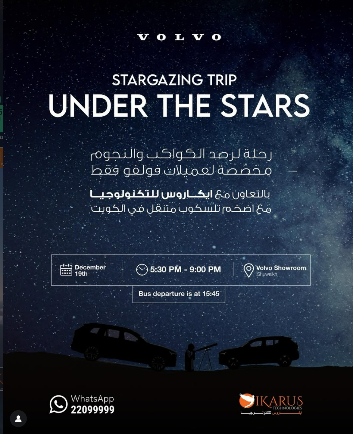 Celebrating 1st year anniversary of Volvo Ladies Club, we invite you to a special Stargazing Trip exclusively for Volvo clients, in collaboration with Ikarus Technologies, featuring the largest mobile telescope in Kuwait.