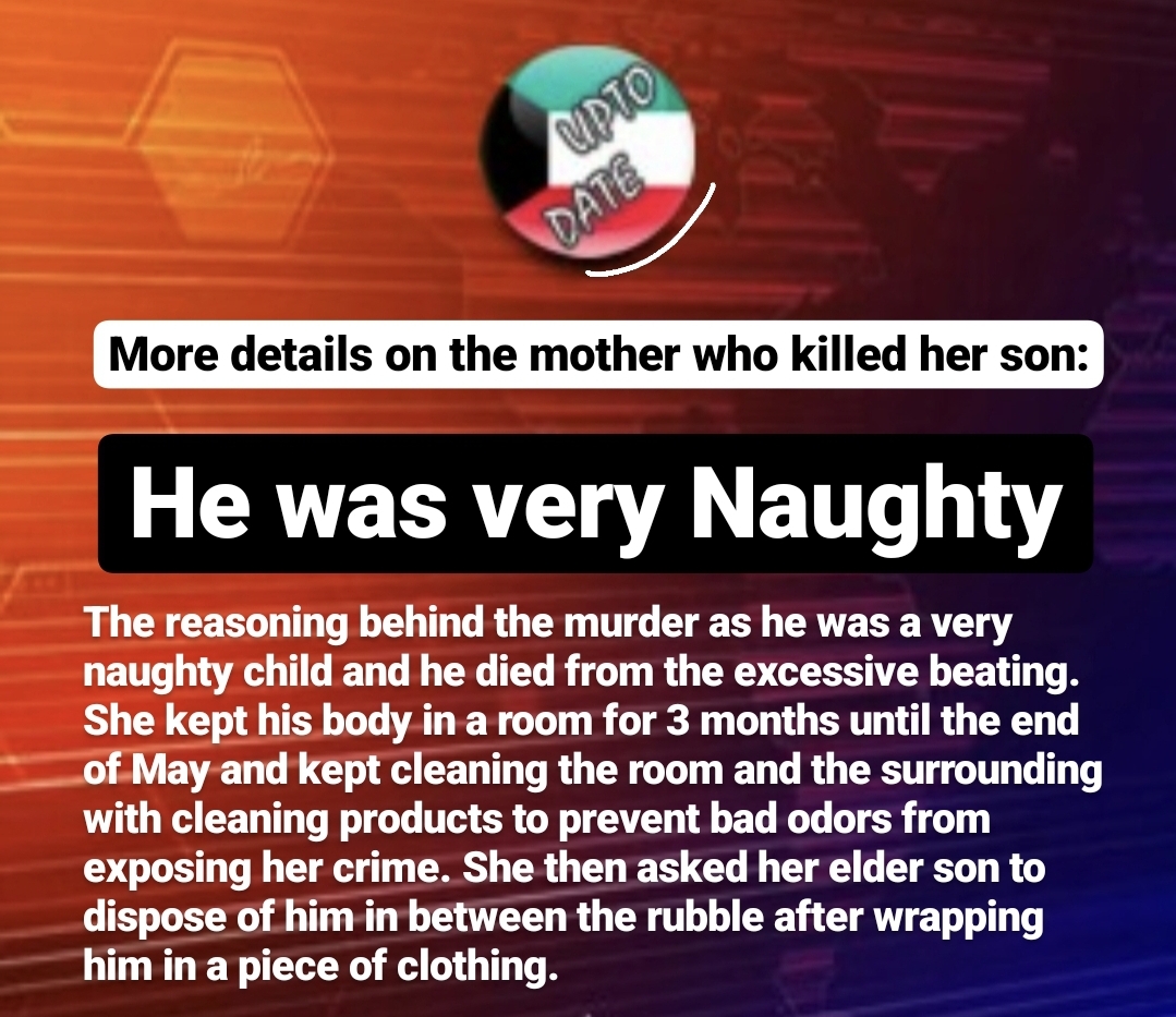 The Ministry of Interior stated that a decomposed body of a child was found buried deliberately by the killer in the West Abdullah Al Mubarak area. Earlier a missing report was filed about the child. As per the sources it was the mother who killed the child in February, she kept the body in her residence for 5 days and filed a missing report.